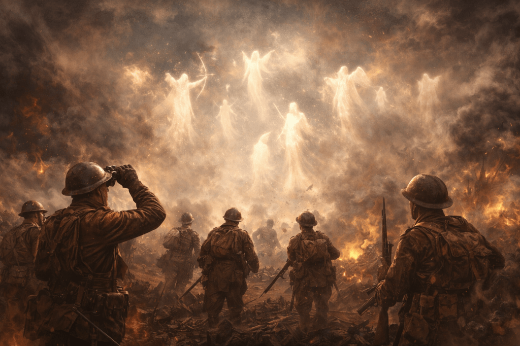 Selon plusieurs récits apparus peu après la bataille, alors que les soldats britanniques reculaient et pensaient être perdus, d’étranges silhouettes lumineuses seraient apparues dans le ciel ou dans la brume du champ de bataille. Certains parlèrent d’anges aux ailes déployées. D’autres évoquèrent des archers célestes, rappelant saint Georges ou des protecteurs invisibles venus ralentir l’avancée ennemie.